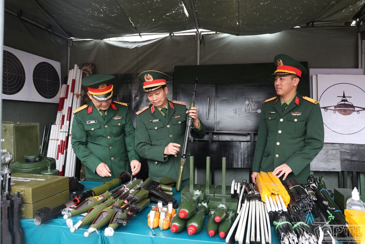 Thiếu tướng Nguyễn Đình Thạo và các đại biểu tham quan mô hình học cụ huấn luyện của các đơn vị.