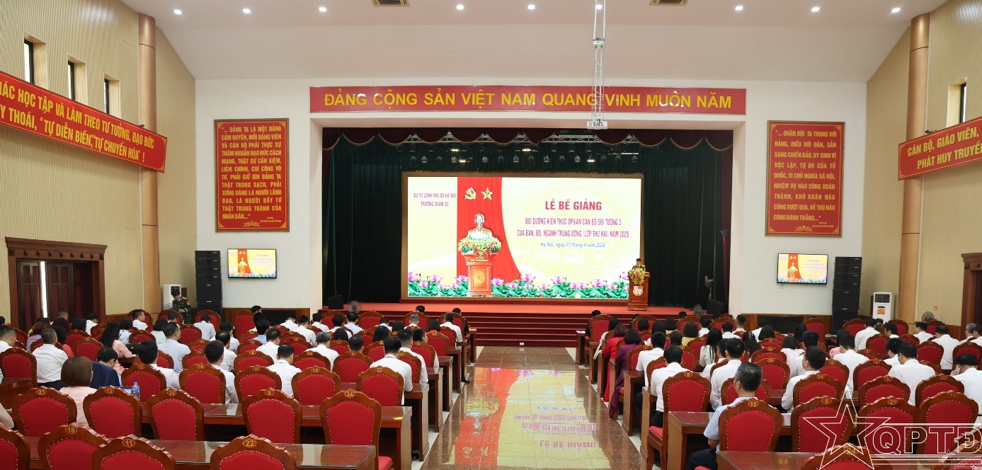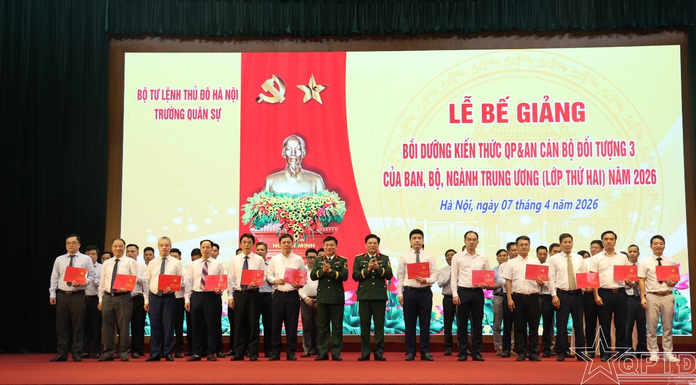 QPTĐ-Chiều 7-4, Trường Quân sự Bộ Tư lệnh Thủ đô Hà Nội đã tổ chức Lễ bế giảng bồi dưỡng kiến thức quốc phòng và an ninh (QP&AN) cán bộ đối tượng 3 của các ban, bộ, ngành Trung ương năm 2026.
