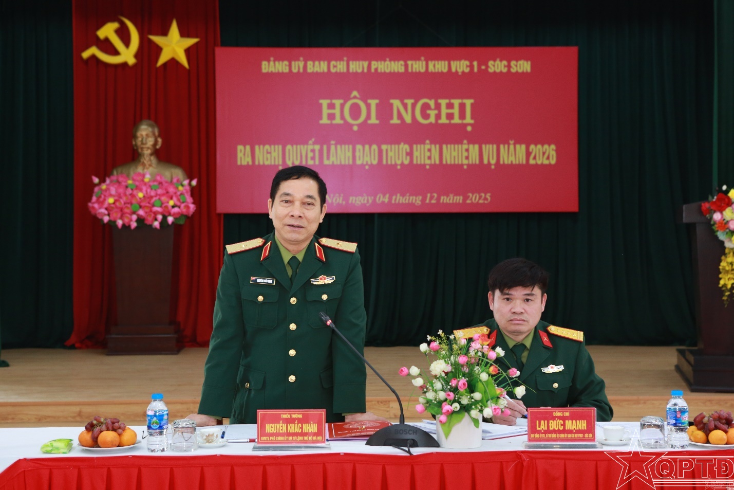 QPTĐ-Sáng 4/12, Đảng ủy Ban CHPTKV1-Sóc Sơn tổ chức hội nghị ra Nghị quyết lãnh đạo thực hiện nhiệm vụ năm 2026, Thiếu tướng Nguyễn Khắc Nhân, Phó Chính uỷ Bộ Tư lệnh Thủ đô Hà Nội dự chỉ đạo hội nghị.