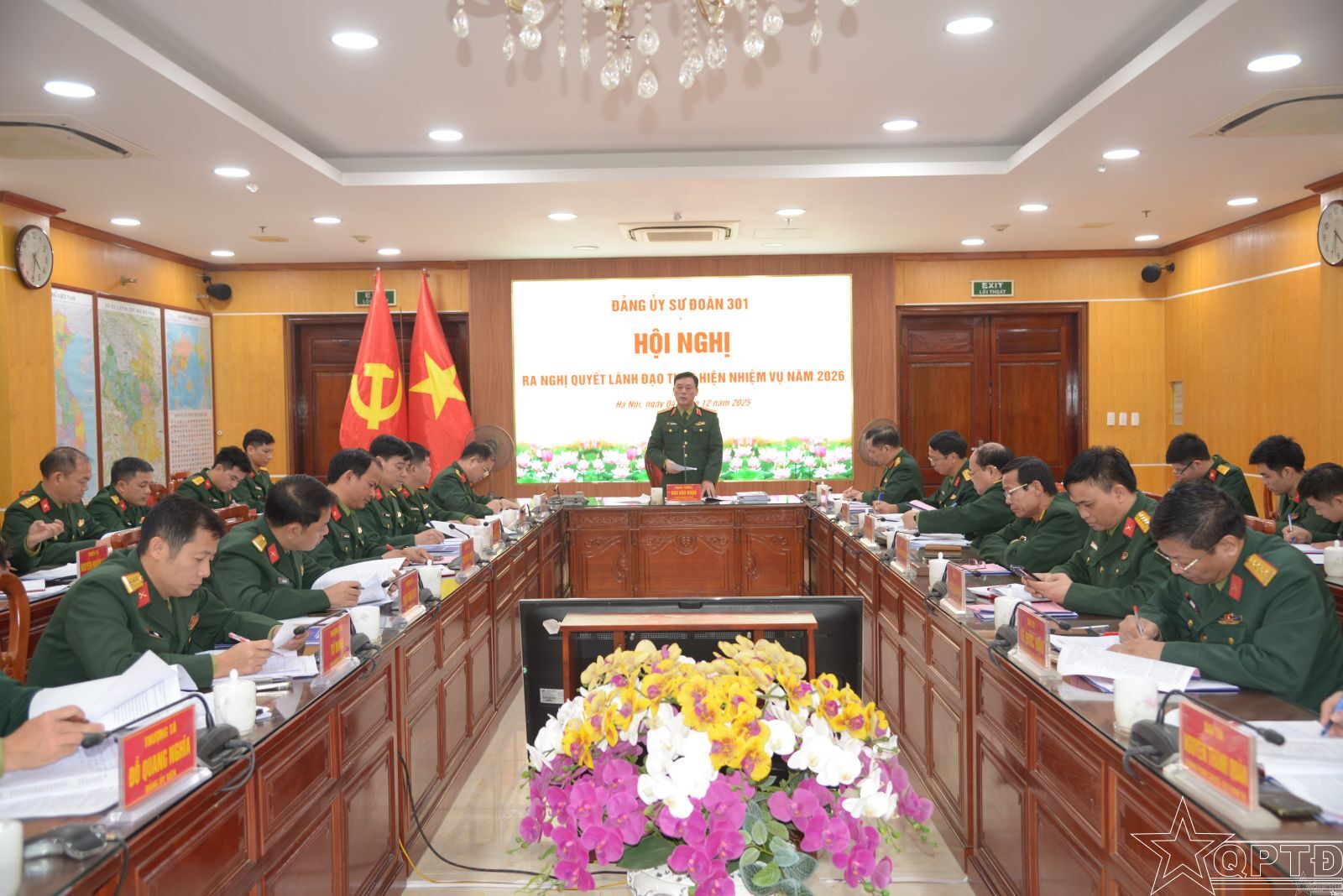 Trên cơ sở kết quả đạt được trong năm 2025, Đảng ủy Sư đoàn 301 xác định một số giải pháp nhằm nâng cao chất lượng lãnh đạo thực hiện nhiệm vụ như: Tăng cường công tác quán triệt, học tập, triển khai thực hiện có chất lượng Nghị quyết Đại hội Đảng bộ các cấp; đẩy mạnh Phong trào Thi đua Quyết thắng năm 2026 gắn với các ngày lễ, sự kiện chính trị quan trọng của Đảng, Nhà nước, Quân đội và thành phố Hà Nội; thực hiện hiệu quả ngày chính trị và văn hóa tinh thần, đối thoại dân chủ ở cơ sở; phát huy tốt vai trò của người đứng đầu cấp ủy, cơ quan, đơn vị trong nắm và giải quyết kịp thời tư tưởng bộ đội; đẩy mạnh thực hiện Phong trào "Bình dân học vụ số"; tăng cường tập huấn, bồi dưỡng nâng cao chất lượng cán bộ...
