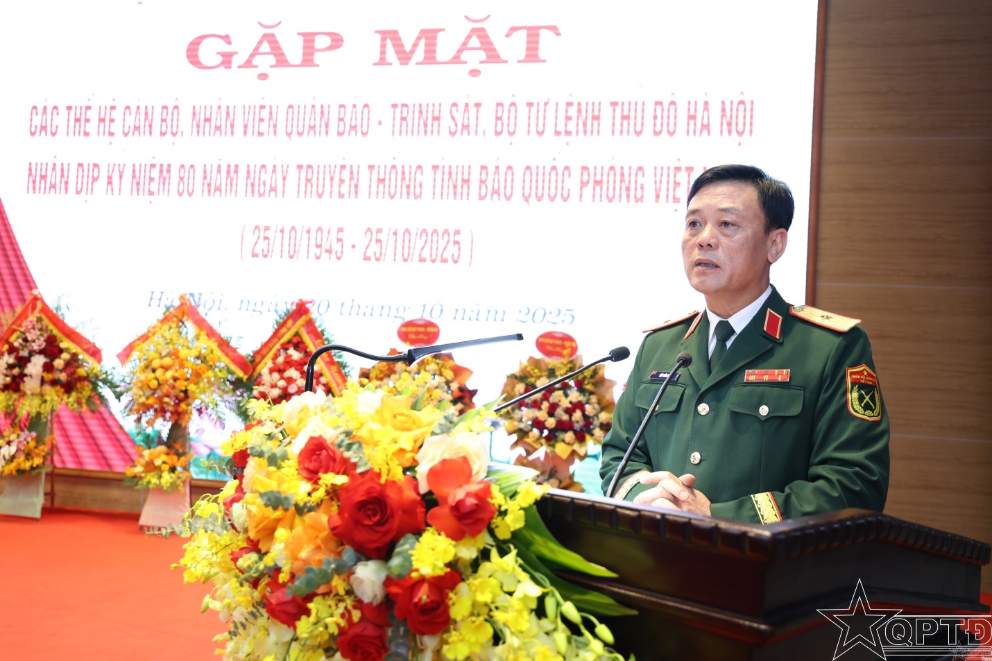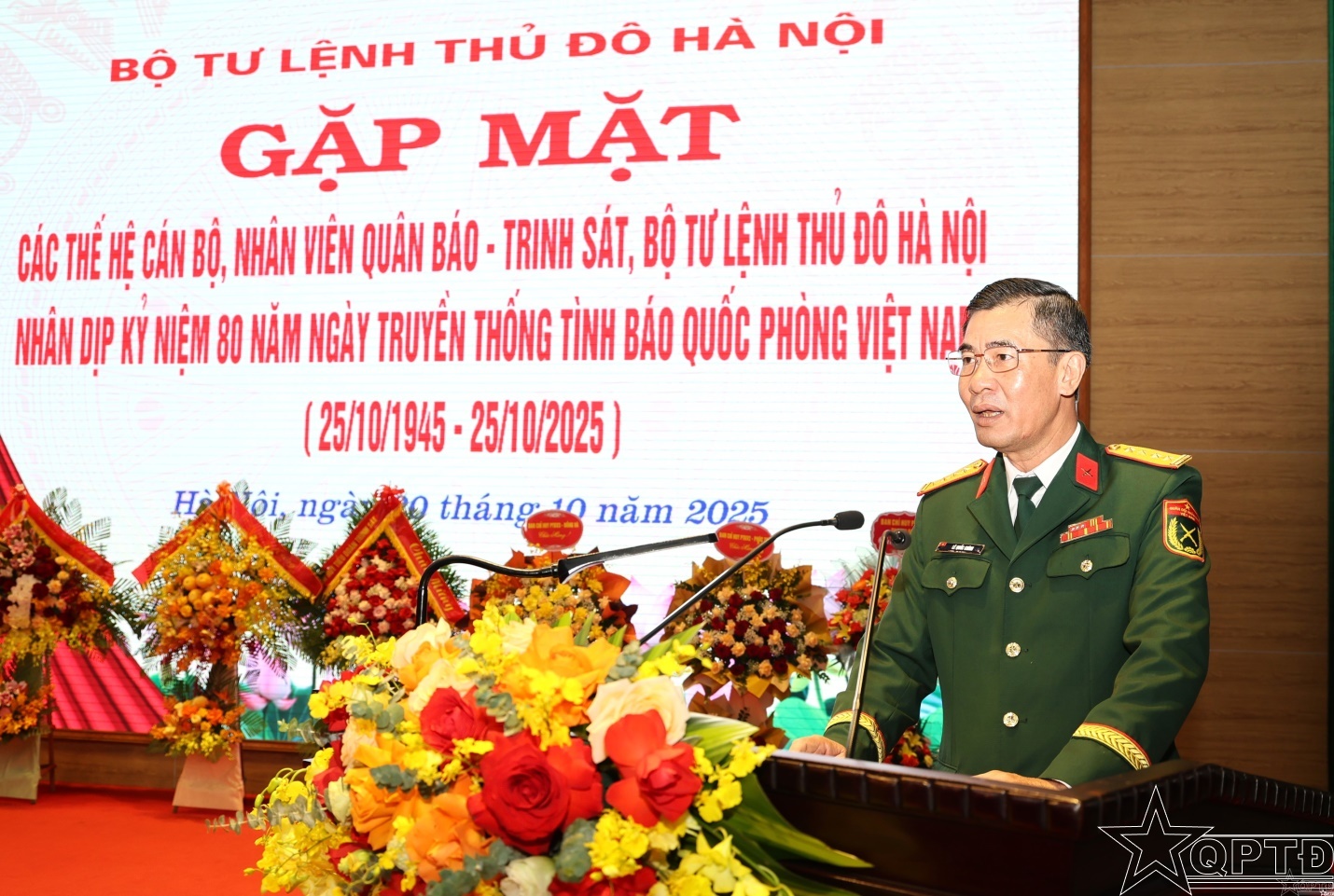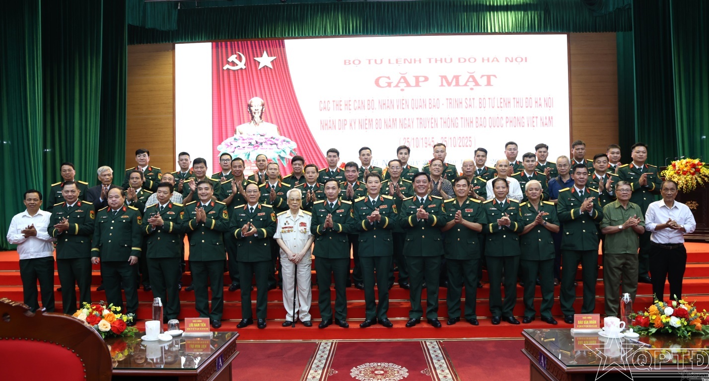 QPTĐ-Nhân dịp kỷ niệm 80 năm Ngày truyền thống Tình báo Quốc phòng Việt Nam (25/10/1945-25/10/2025), sáng 20-10, Bộ Tư lệnh Thủ đô đã gặp mặt cán bộ, nhân viên Quân báo-Trinh sát của Bộ Tư lệnh Thủ đô Hà Nội. Dự buổi gặp mặt có các đồng chí: Thiếu tướng Bùi Huy Đới, Cục trưởng Cục 71, Tổng cục II; Thiếu tướng Đào Văn Nhận, Ủy viên Ban Thường vụ Thành ủy, Tư lệnh Bộ Tư Bộ Tư lệnh Thủ đô Hà Nội; Thiếu tướng Lưu Nam Tiến, Thành ủy viên, Phó Bí thư Trường trực Đảng ủy, Chính ủy Bộ Tư lệnh; Thiếu tướng Nguyễn Đình Thạo, Phó Tư lệnh kiêm Tham mưu trưởng; Thiếu tướng Trần Minh Toản, Phó Tư lệnh Bộ Tư lệnh Thủ đô Hà Nội. Dự gặp mặt còn có đại biểu lãnh đạo, chỉ huy các cơ quan, đơn vị trực thuộc Bộ Tư lệnh; cán bộ, nhân viên ngành Quân báo-Trinh sát của Bộ Tư lệnh qua các thời kỳ.
