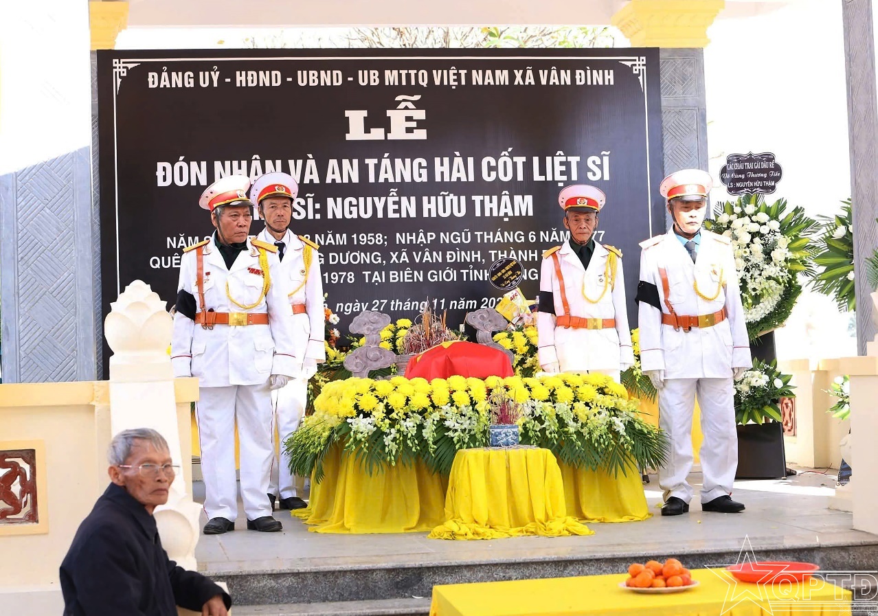 QPTĐ-Trong không khí trang nghiêm, nghĩa tình, sáng ngày 27-11, Đảng ủy, HĐND, UBND, Ủy ban MTTQ Việt Nam và nhân dân xã Vân Đình (thành phố Hà Nội) long trọng tổ chức Lễ đón nhận và an táng hài cốt Liệt sĩ Nguyễn Hữu Thậm, người con ưu tú của thôn Đông Dương, đã anh dũng hy sinh vì độc lập, tự do của Tổ quốc.
