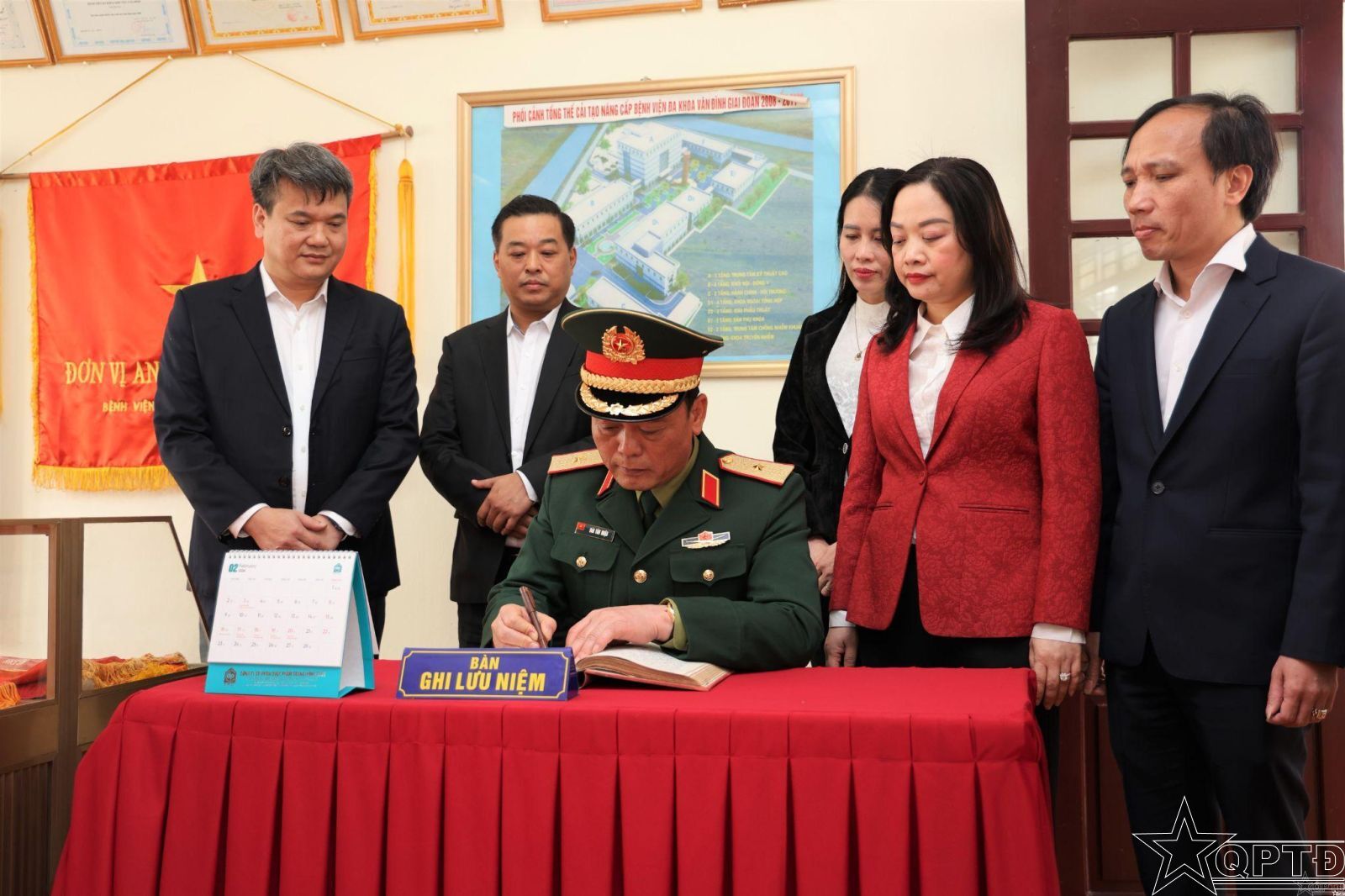 Thiếu tướng Đào Văn Nhận viết lưu bút tại phòng truyền thống Bệnh viện Đa khoa Vân Đình.