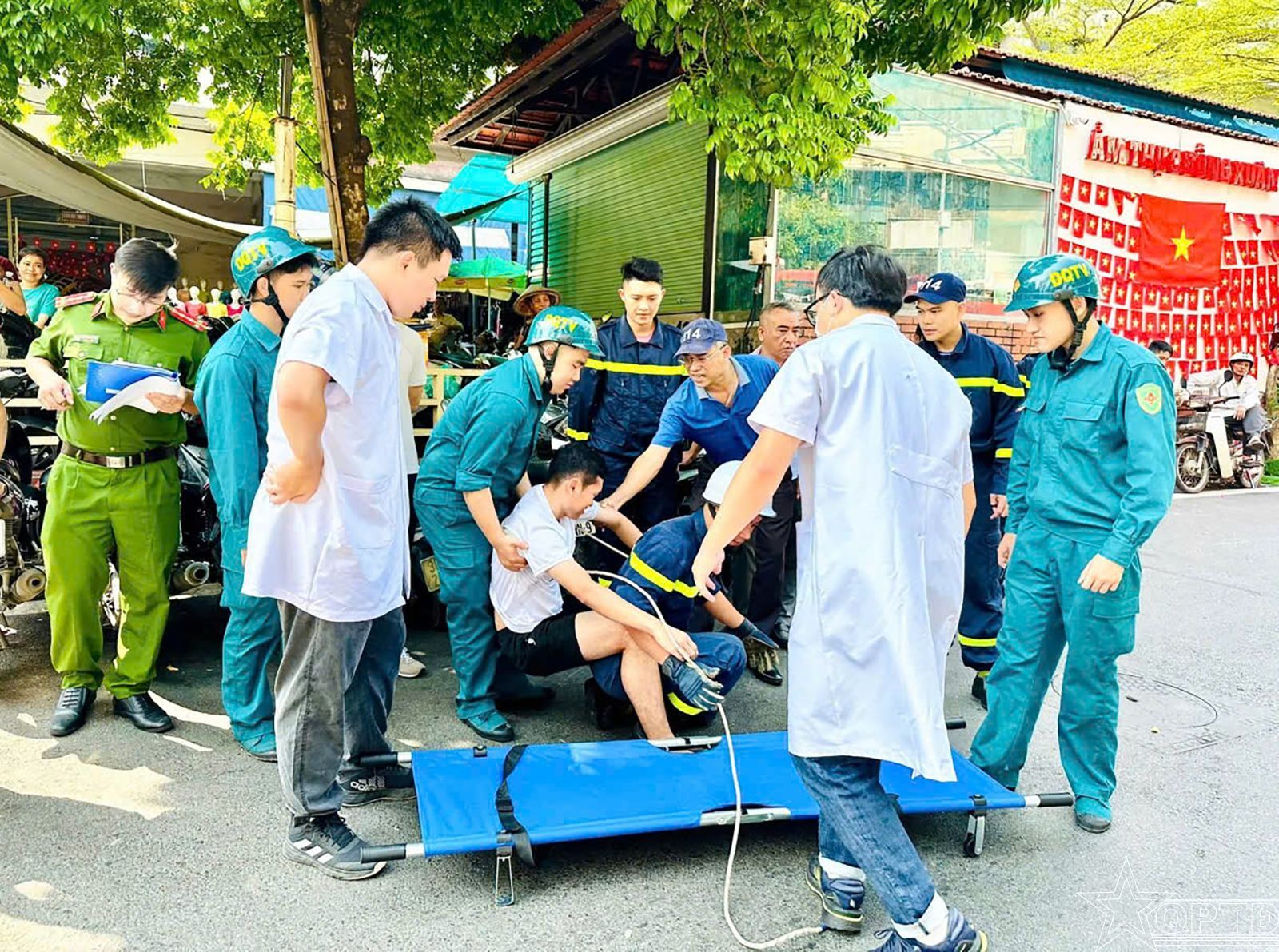 Dân quân phường Hoàn Kiếm, thành phố Hà Nội tham gia thực binh diễn tập phòng cháy, chữa cháy trên địa bàn.