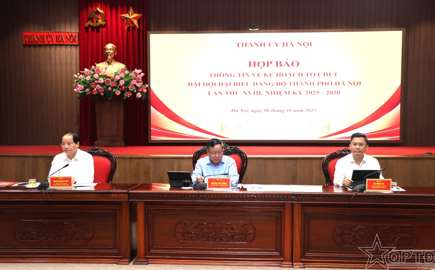 QPTĐ-Sáng 8-10, Thành ủy Hà Nội tổ chức họp báo thông tin về Đại hội đại biểu Đảng bộ thành phố Hà Nội lần thứ XVIII, nhiệm kỳ 2025-2030. Đồng chí Nguyễn Văn Phong, Phó Bí thư Thường trực Thành ủy chủ trì hội nghị. Dự hội nghị có các đồng chí Ủy viên Ban Thường vụ Thành ủy: Hà Minh Hải, Trưởng ban Tổ chức Thành ủy; Nguyễn Doãn Toản, Trưởng ban Tuyên giáo và Dân vận Thành ủy; Trần Thanh Hà, Chánh Văn phòng Thành ủy. Tham dự hội nghị có đại diện lãnh đạo, phóng viên các cơ quan báo chí Trung ương và Hà Nội.