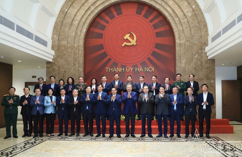 Tổng Bí thư Tô Lâm, Thủ tướng Chính phủ Phạm Minh Chính, Chủ tịch Quốc hội Trần Thanh Mẫn làm việc với Ban Thường vụ Thành ủy Hà Nội.