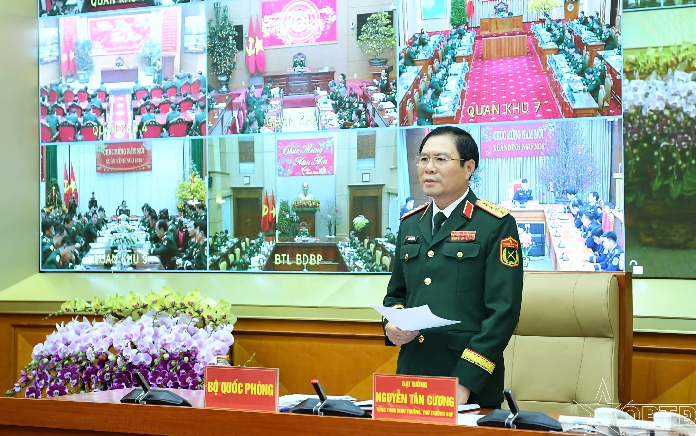 Về nhiệm vụ năm 2026, Đại tướng Nguyễn Tân Cương yêu cầu toàn quân cần quán triệt, thực hiện nghiêm túc, có hiệu quả “2 kiên định, 2 đẩy mạnh, 2 ngăn ngừa”, “5 vững” và chỉ đạo của đồng chí Tổng Bí thư Tô Lâm tại Phiên họp Quân ủy Trung ương lần thứ 15; chủ động đổi mới, sáng tạo; tập trung triển khai các mặt công tác bảo đảm chặt chẽ, khoa học, khả thi, tạo khí thế thi đua sôi nổi, phấn đấu hoàn thành tốt nhiệm vụ ngay từ những ngày đầu, tháng đầu của năm 2026. Một số nhiệm vụ trọng tâm cần triển khai ngay là tiếp tục tổ chức cho bộ đội đón Tết Nguyên đán Bính Ngọ 2026 thực sự vui tươi, lành mạnh, an toàn, tiết kiệm, SSCĐ cao, kịp thời xử lý hiệu quả các tình huống, không để bị động, bất ngờ. Phối hợp tổ chức thành công bầu cử đại biểu Quốc hội khóa XVI và đại biểu HĐND các cấp nhiệm kỳ 2026-2031. Chuẩn bị chu đáo, tổ chức giao nhận quân đúng kế hoạch, bảo đảm chất lượng, đủ chỉ tiêu. Bảo đảm đầy đủ lương thực, thực phẩm, rau củ quả sạch, doanh trại, nơi ăn ở, điện nước, tạo ấn tượng tốt cho các chiến sĩ mới từ những ngày đầu về đơn vị. Tổ chức tốt việc tập huấn ở các cấp để chuẩn bị cho một năm huấn luyện, đào tạo, SSCĐ thực chất, đáp ứng yêu cầu tăng tốc, bứt phá. Kiểm tra chặt chẽ vũ khí trang bị, phương tiện kỹ thuật và các mặt công tác bảo đảm để đáp ứng yêu cầu nhiệm vụ. Tổ chức tốt “Tết trồng cây đời đời nhớ ơn Bác Hồ”, xây dựng cơ quan, đơn vị chính quy, “sáng, xanh, sạch, đẹp”.