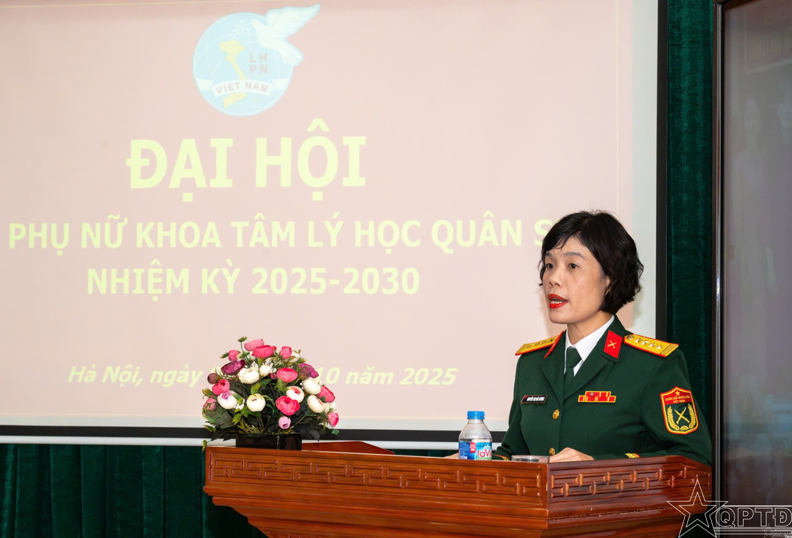 Đại tá Nguyễn Thị Đắc Hương, Chủ nhiệm Bộ môn Khoa Tâm lý phát biểu tại Đại hội Phụ nữ Khoa Tâm lý, Học viện Chính trị.
