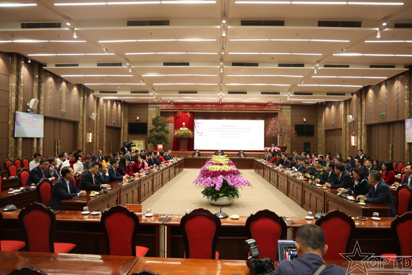 Quang cảnh chúc Tết của đồng chí Tổng Bí thư Tô Lâm tại hội trường Thành ủy Hà Nội.