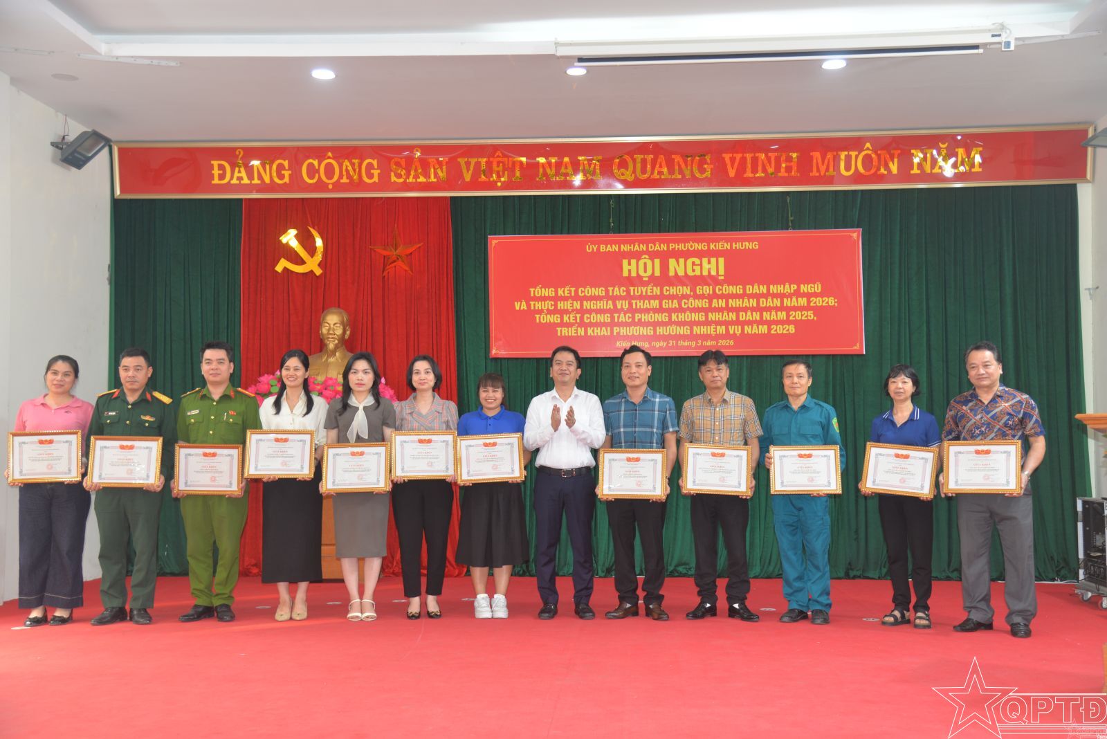 Năm 2026, phường Kiến Hưng đã hoàn thành 100% chỉ tiêu được giao, với tổng số 24 công dân lên đường nhập ngũ, trong đó 20 công dân thực hiện nghĩa vụ quân sự và 4 công dân thực hiện nghĩa vụ tham gia Công an nhân dân. Chất lượng tân binh tiếp tục được nâng lên, đa số có trình độ văn hóa THPT trở lên, sức khỏe loại 1, 2, 3 chiếm tỉ lệ cao. Công tác tuyển chọn, gọi công dân nhập ngũ và thực hiện nghĩa vụ tham gia Công an nhân dân được triển khai đồng bộ theo đúng quy trình hướng dẫn, đảm bảo chất lượng. Quá trình thực hiện, phường đã huy động sự vào cuộc của cả hệ thống chính trị với sự vào cuộc tích cực của cán bộ, đảng viên và các tầng lớp Nhân dân. Công tác chính sách hậu phương quân đội được thực hiện kịp thời; các ban, ngành, đoàn thể tổ chức thăm hỏi, động viên thanh niên trước ngày lên đường nhập ngũ, tạo khí thế phấn khởi trong Nhân dân.