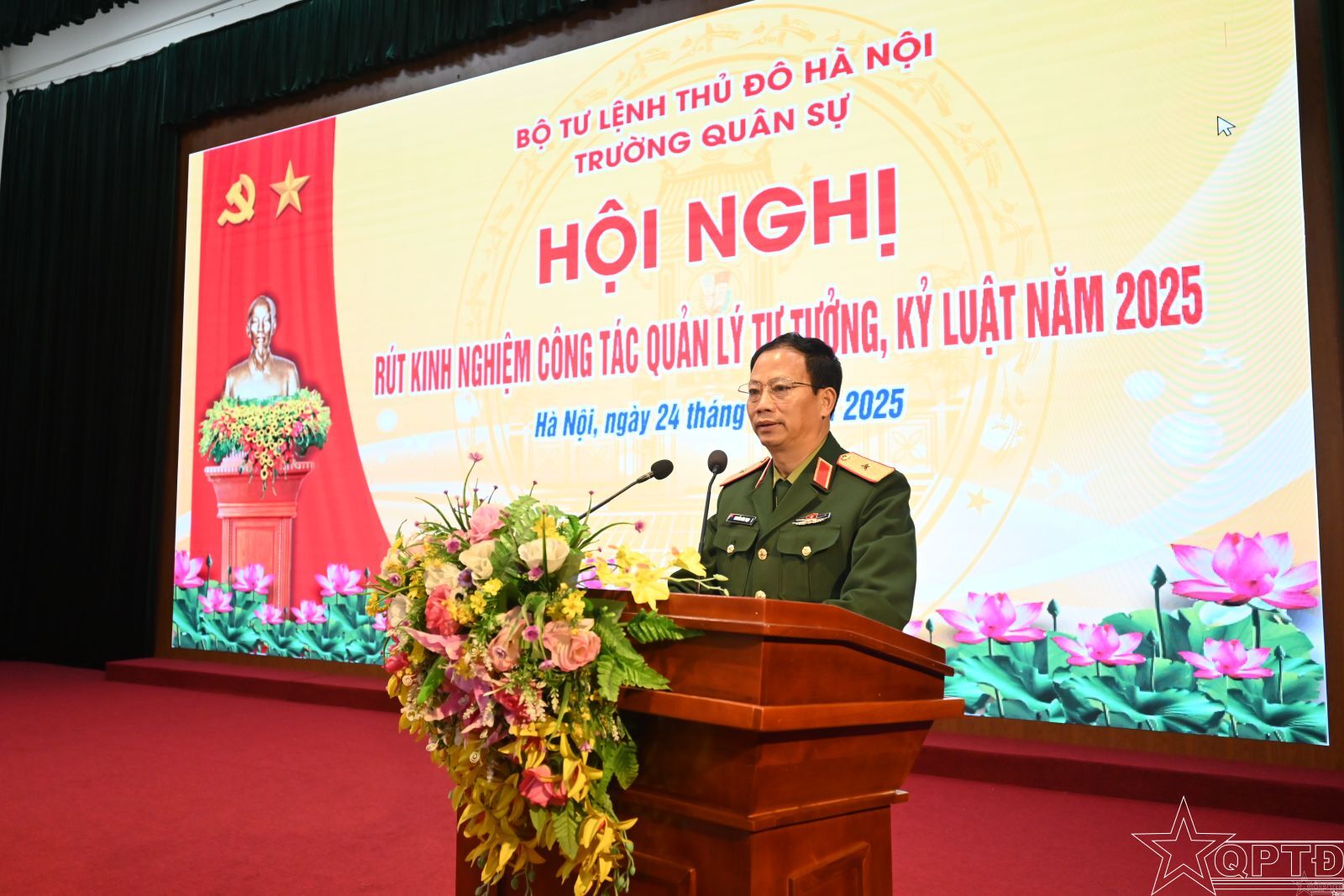 Phát biểu tại Hội nghị, Thiếu tướng Nguyễn Đình Thạo đã ghi nhận và đánh giá cao kết quả Trường Quân sự đã đạt được trong năm 2025. Thời gian tới, trước những tác động của tình hình thế giới, trong nước và Thủ đô, đồng chí Phó Tư lệnh kiêm Tham mưu trưởng Bộ Tư lệnh Thủ đô Hà Nội đã nhấn mạnh đến vai trò, tầm quan trọng của công tác quản lý tư tưởng, kỷ luật; đồng thời yêu cầu Nhà trường cần tập trung thực hiện một số nội dung như: Tăng cường công tác lãnh đạo, chỉ đạo, phát huy vai trò của chính ủy, chính trị viên trong công tác quản lý tư tưởng, kỷ luật; nâng cao công tác tuyên truyền, giáo dục, phổ biến pháp luật, kết hợp giáo dục pháp luật với siết chặt kỷ luật; thường xuyên nắm, dự báo tình hình tư tưởng của quân nhân, nhất là những trường hợp có hoàn cảnh khó khăn, phức tạp; phát huy tốt vai trò của đội ngũ cán bộ, vai trò của các tổ chức trong việc quản lý tư tưởng, kỷ luật của quân nhân…
