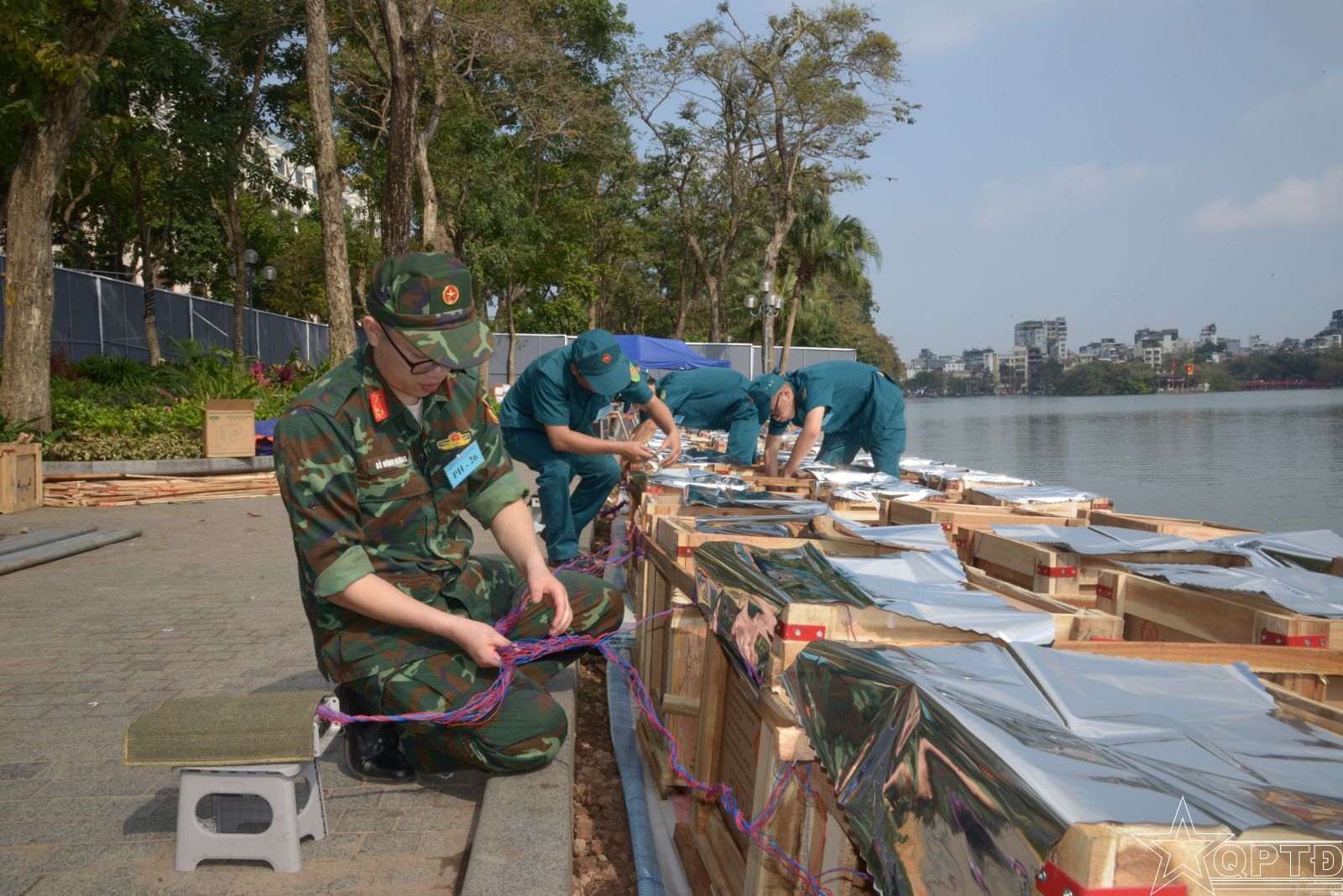 Cán bộ, chiến sĩ Tiểu đoàn Công binh 544 triển khai phương tiện, thiết bị bắn pháo hoa ra các cụm hỏa thuật.
