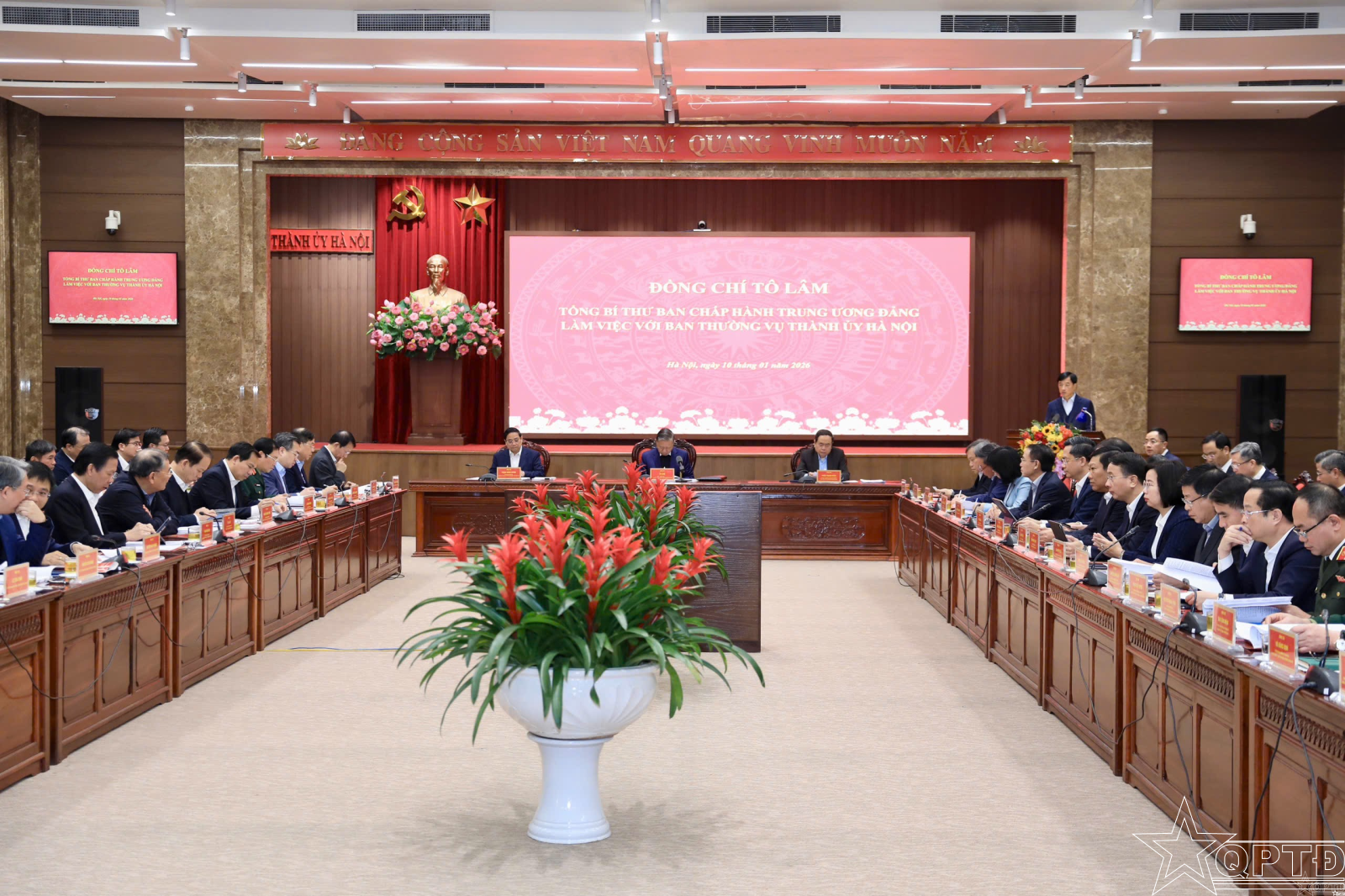 QPTĐ-Sáng 10-1, tại trụ sở Thành ủy Hà Nội, Tổng Bí thư Tô Lâm cùng các đồng chí Ủy viên Bộ Chính trị: Thủ tướng Chính phủ Phạm Minh Chính, Chủ tịch Quốc hội Trần Thanh Mẫn đã có buổi làm việc với Ban Thường vụ Thành ủy Hà Nội về đề xuất xây dựng Quy hoạch tổng thể Thủ đô tầm nhìn 100 năm gắn với hoàn thiện thể chế phát triển; định hướng mô hình phát triển kinh tế - xã hội và mục tiêu tăng trưởng hai con số trong giai đoạn tới.