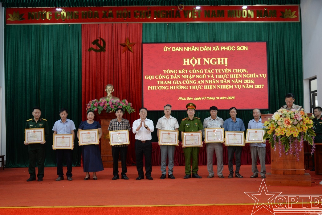 Nhân dịp này, UBND xã Phúc Sơn đã trao giấy khen cho 09 tập thể và 24 cá nhân có thành tích tiêu biểu trong công tác tuyển chọn, gọi công dân nhập ngũ năm 2026.