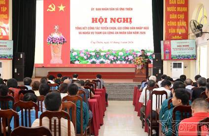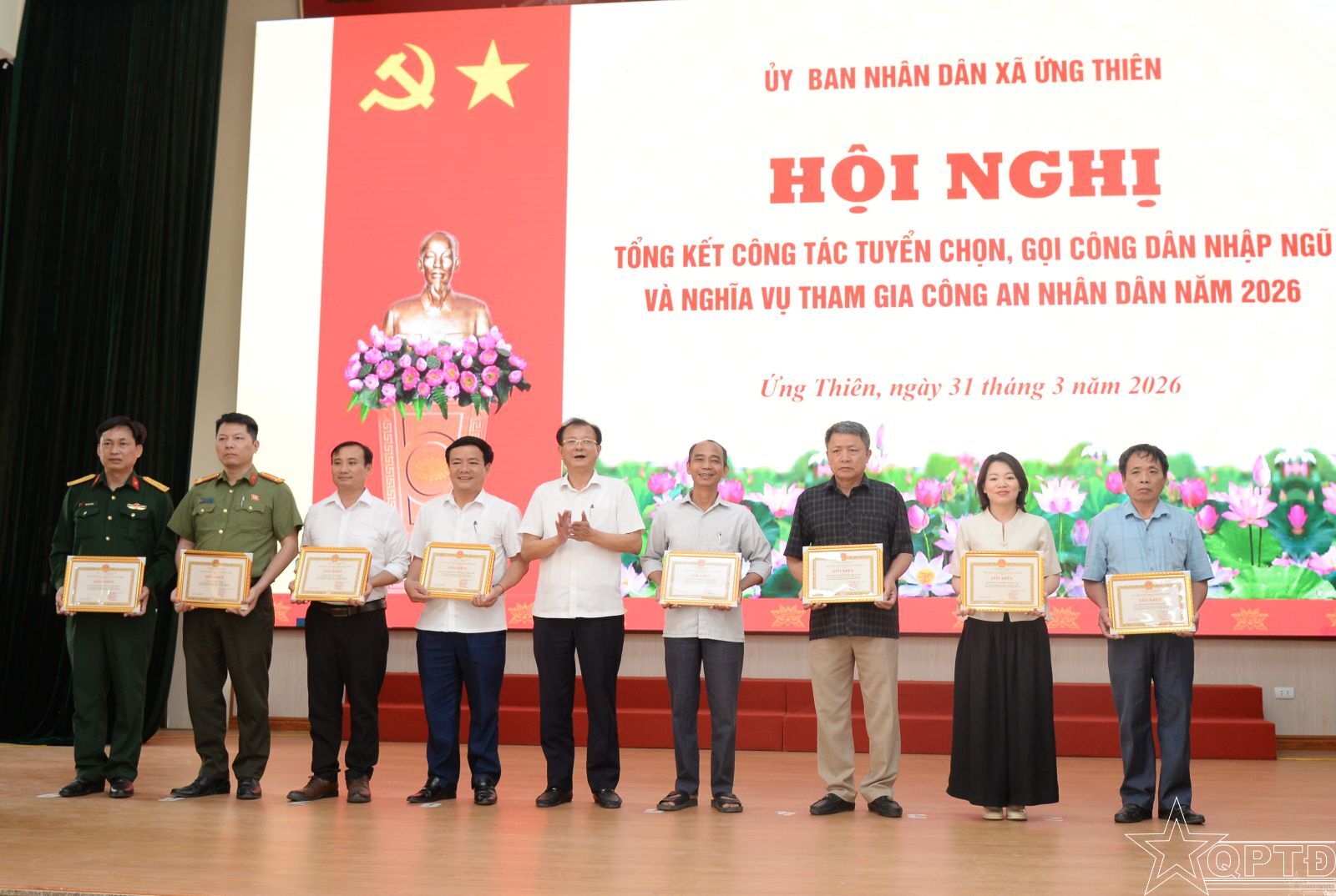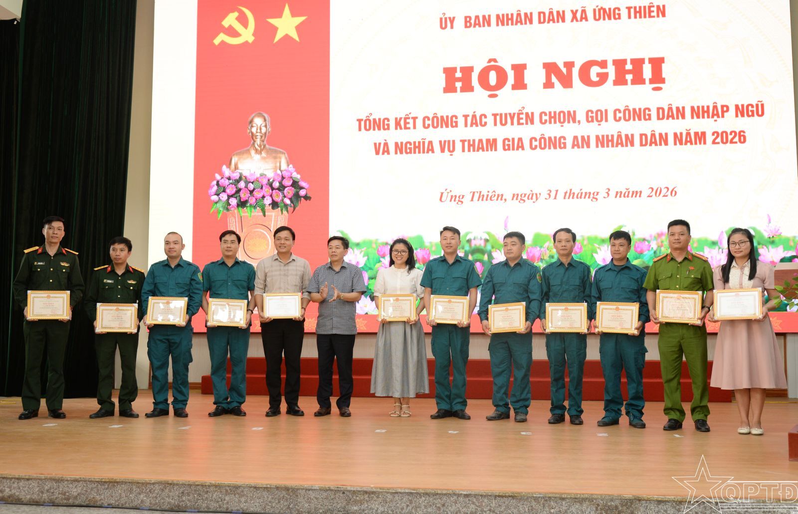 QPTĐ-Chiều ngày 31-3, xã Ứng Thiên (thành phố Hà Nội) tổ chức Hội nghị tổng kết công tác tuyển chọn, gọi công dân nhập ngũ và thực hiện nghĩa vụ tham gia Công an nhân dân năm 2026; công tác giáo dục quốc phòng – an ninh; công tác phòng không nhân dân năm 2025, đồng thời đề ra phương hướng, nhiệm vụ năm 2026.