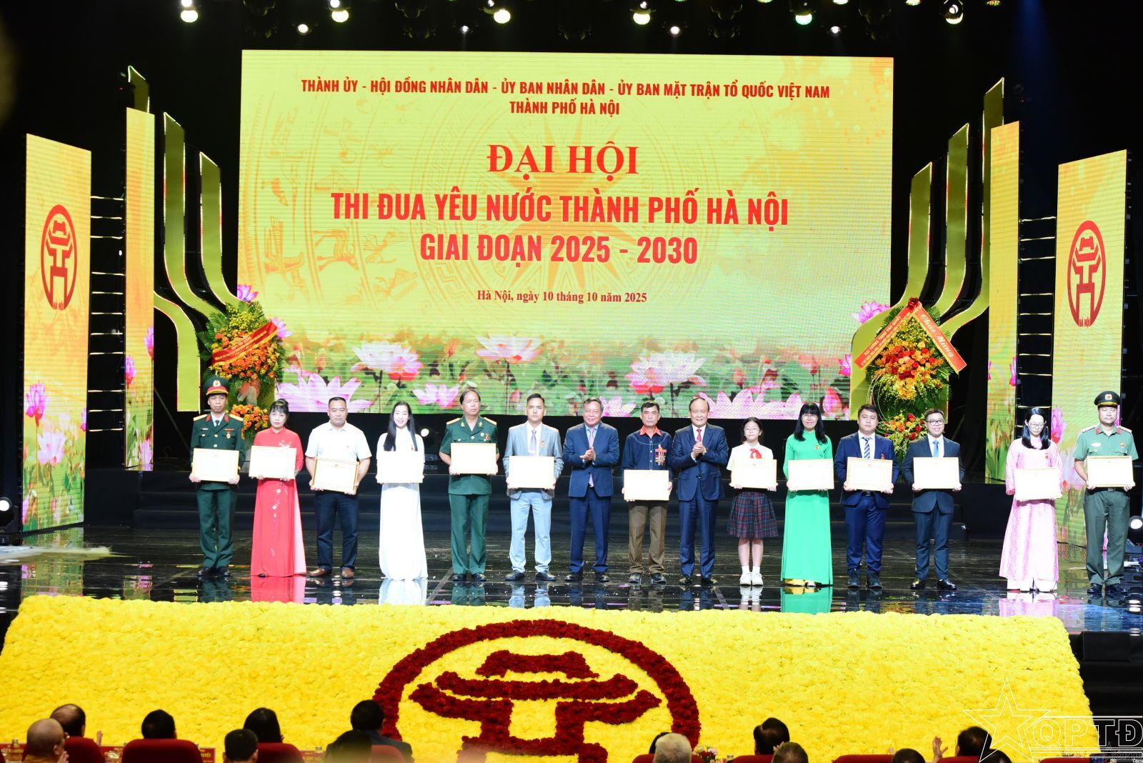 Trung tá Nguyễn Bá Quang, người mặc quân phục đứng ngoài cùng (bên trái ảnh) nhận danh hiệu Người tốt việc tốt thành phố Hà Nội năm 2025.