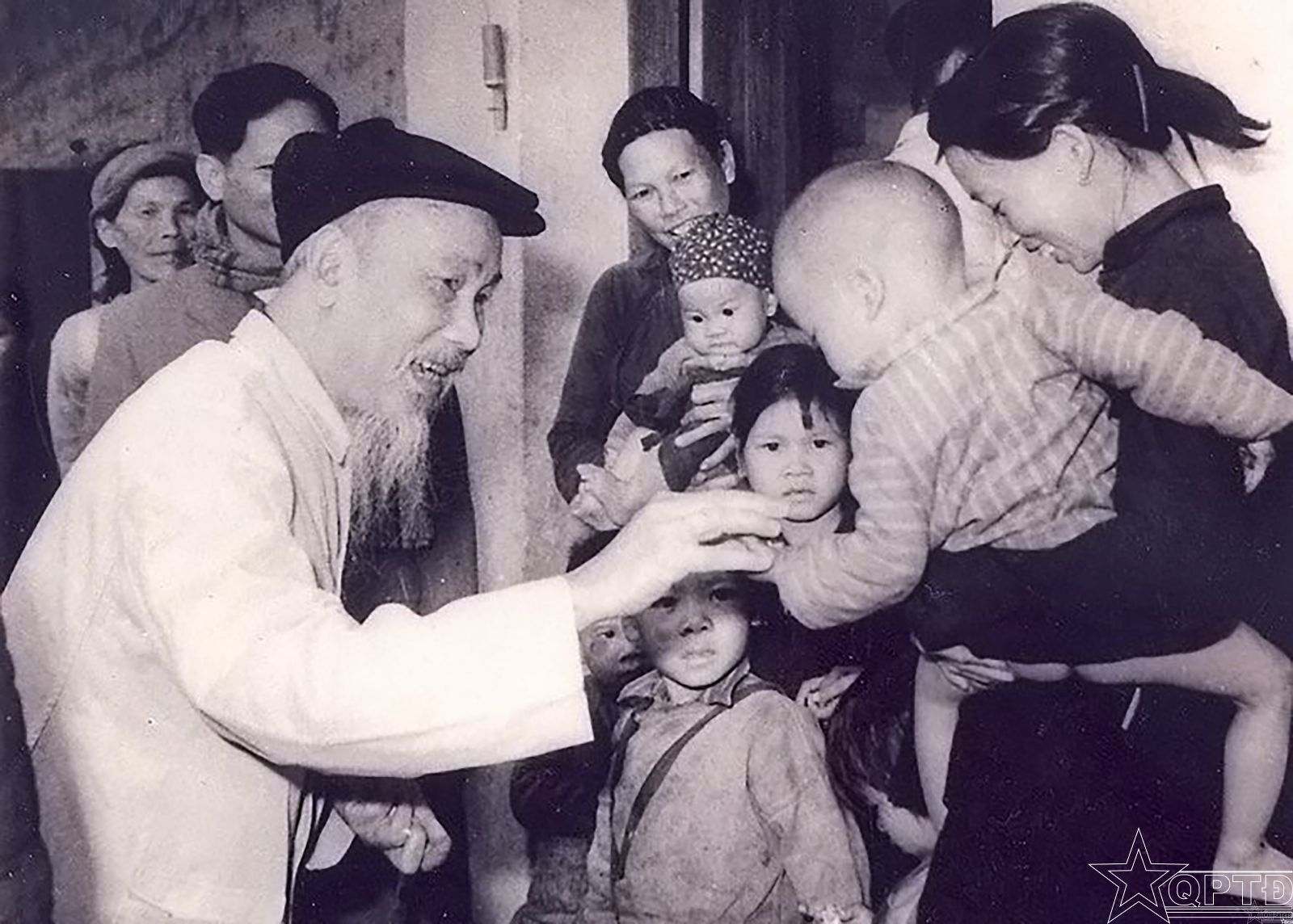 Bác Hồ chia quà Tết cho các cháu nhỏ ở Hợp tác xã Khe Cát, huyện Yên Hưng, tỉnh Quảng Ninh ngày 2-2-1965. (Ảnh tư liệu)