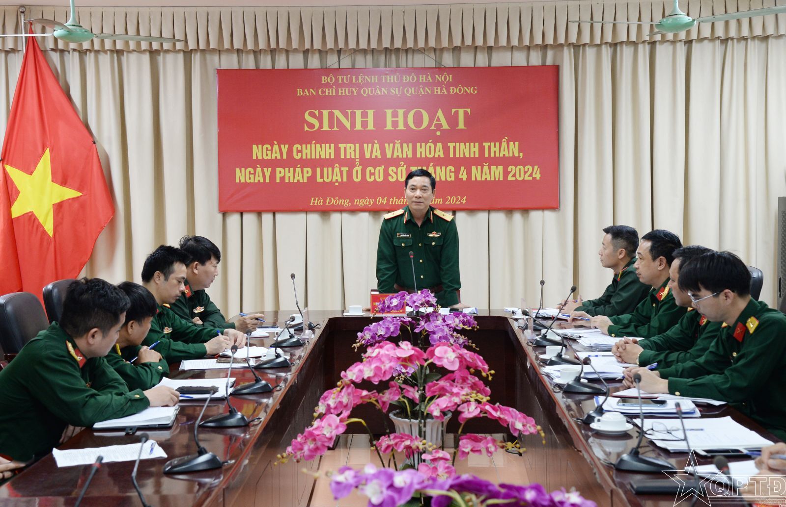 QPTĐ-Chiều 4-4, Ban CHQS quận Hà Đông tổ chức sinh hoạt Ngày Chính trị và Văn hóa tinh thần, Ngày Pháp luật tháng 4. Thiếu tướng Nguyễn Khắc Nhân, Phó Chính ủy Bộ Tư lệnh Thủ đô Hà Nội dự, phát biểu chỉ đạo.