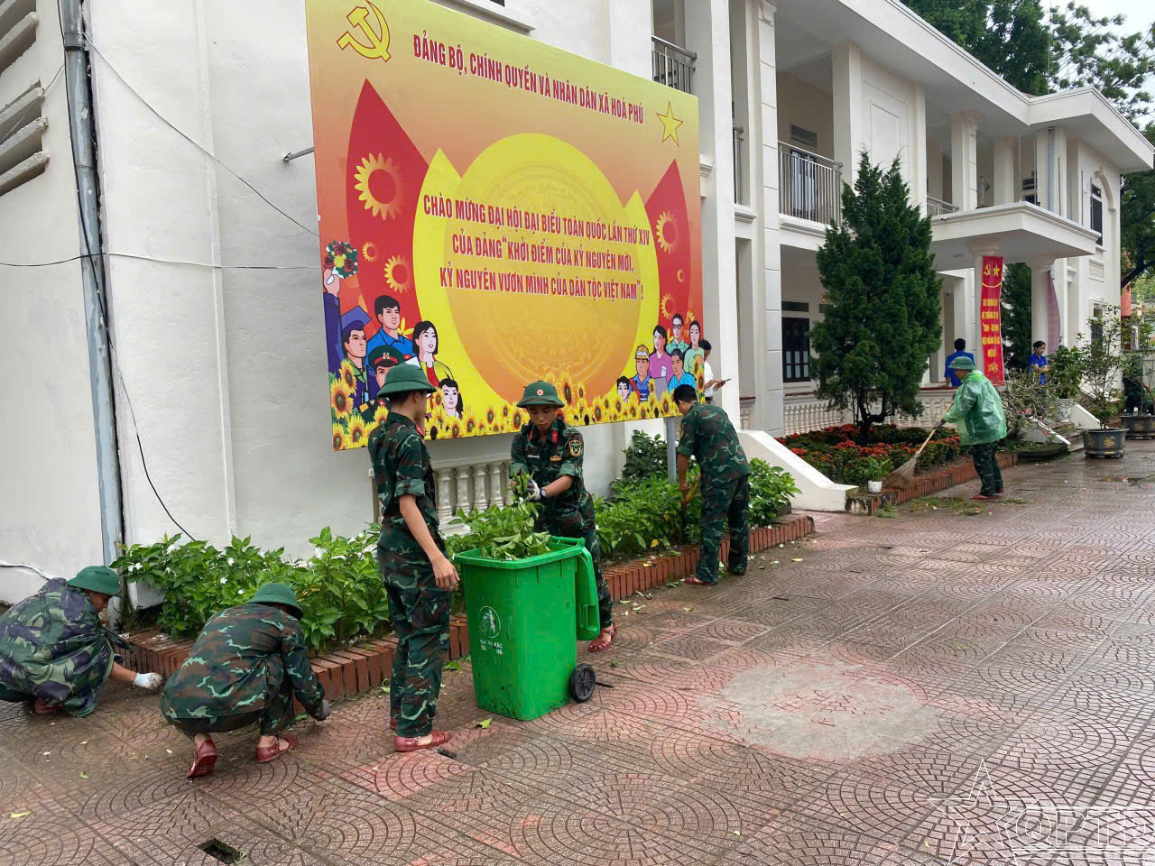 Cán bộ, chiến sĩ Tiểu đoàn Trinh sát 20 hành quân dã ngoại làm công tác dân vận tại xã Hòa Phú, thành phố Hà Nội.