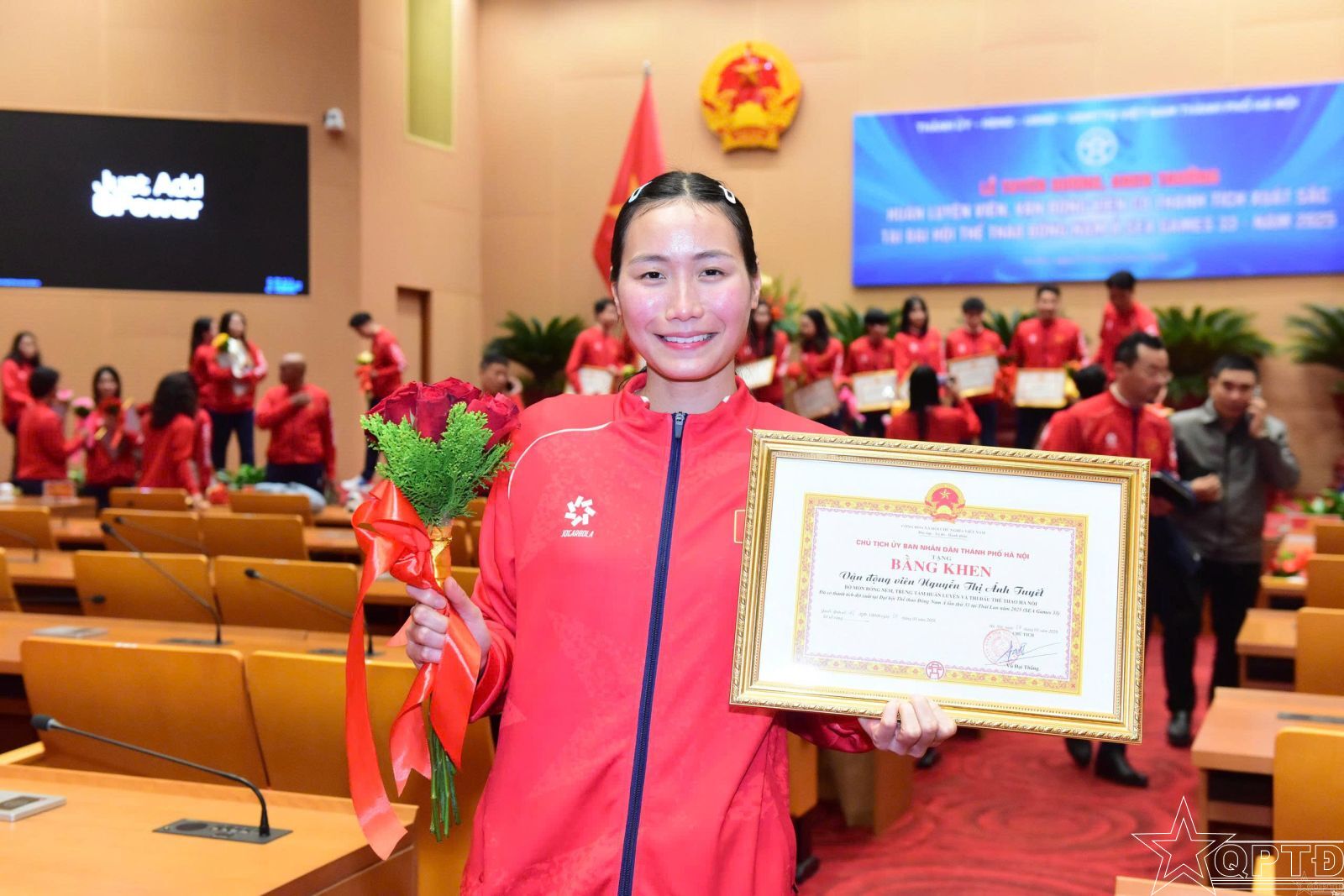 Nụ cười rạng rỡ của Nguyễn Thị Ánh Tuyết bên tấm bằng khen của UBND TP Hà Nội – thành quả xứng đáng cho những giọt mồ hôi và sự nỗ lực không ngừng nghỉ trên sân tập.